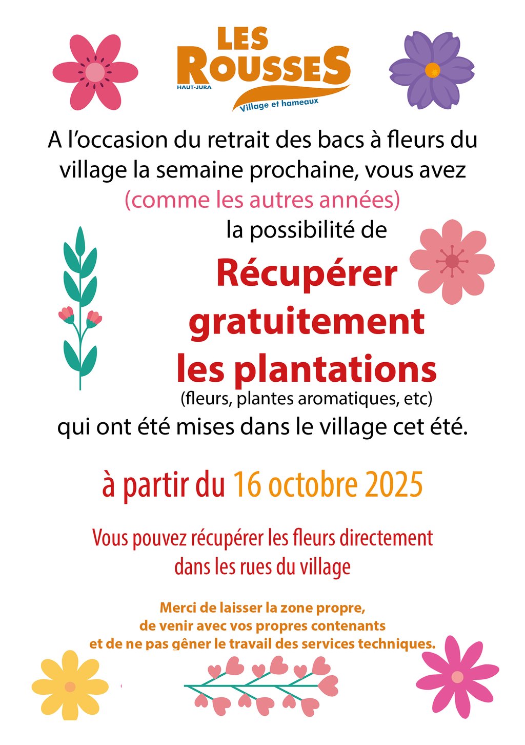 À l’occasion du retrait des bacs à fleurs du village la semaine prochaine, vous avez (comme les autres années) la possibilité de récupérer gratuitement les plantations (fleurs, plantes aromatiques, etc) qui ont été mises dans le village cet été.