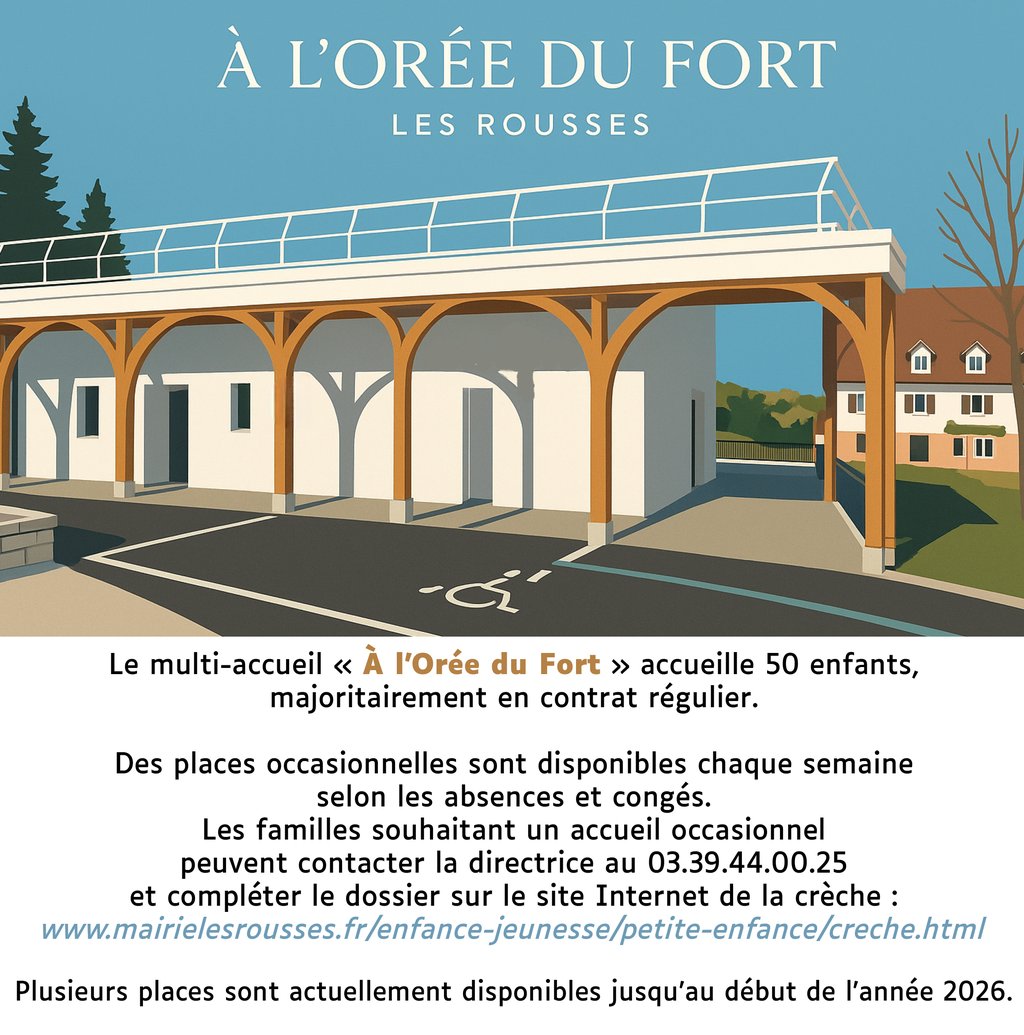 Le multi-accueil « À l’Orée du Fort » accueille 50 enfants, majoritairement en contrat régulier. Des places occasionnelles sont disponibles chaque semaine selon les absences et congés. Les familles souhaitant un accueil occasionnel peuvent contacter la directrice au 03.39.44.00.25 et compléter le dossier sur le site Internet de la crèche : http://www.mairielesrousses.fr/enfance-jeunesse/petite-enfance/creche.html . Plusieurs places sont actuellement disponibles jusqu’au début de l’année 2026.